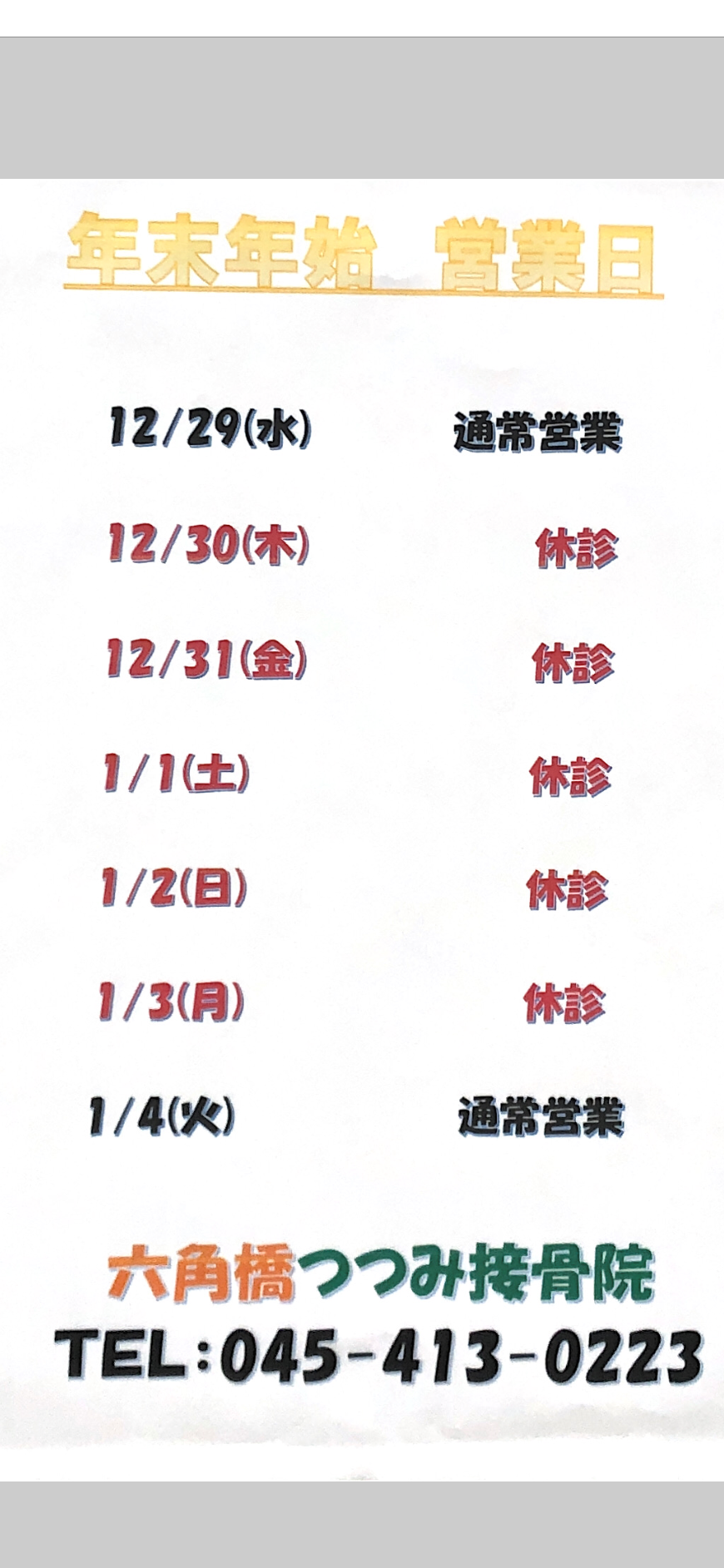 年末年始の診療日は、以下の通りです!